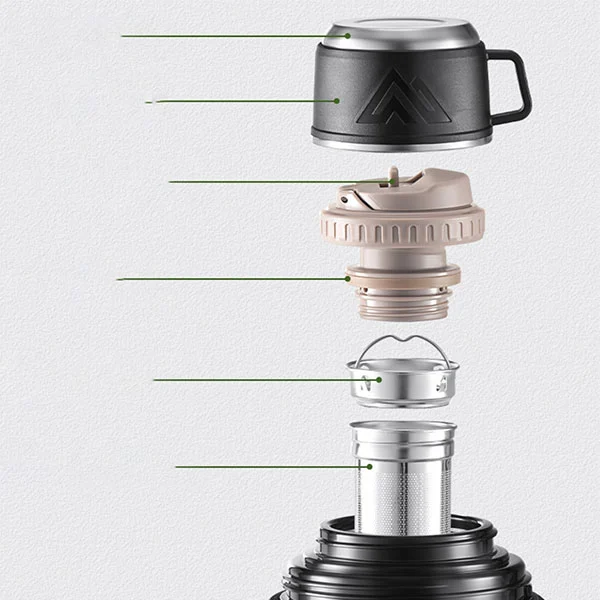 Вакуум изолиран чайник за пътуване, изработен от 316 неръждаема стомана и 201 неръждаема стомана, с вътрешна облицовка, изработена от висококачествена 316 неръждаема стомана, която е анти-окисляване и няма миризма дори след дългосрочно съхранение на вода.